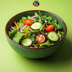 A vibrant mix of crisp lettuce, juicy tomatoes, cucumbers, served with a light dressing for a healthy, refreshing side.